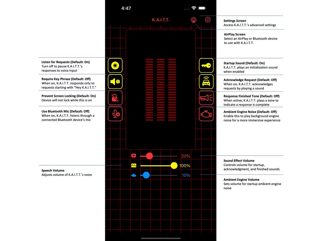 The key phrase “Hey K.A.I.T.T.” is required to initiate automations. If the A.I.’s name has been customized, substitute “K.A.I.T.T.” with your chosen name.